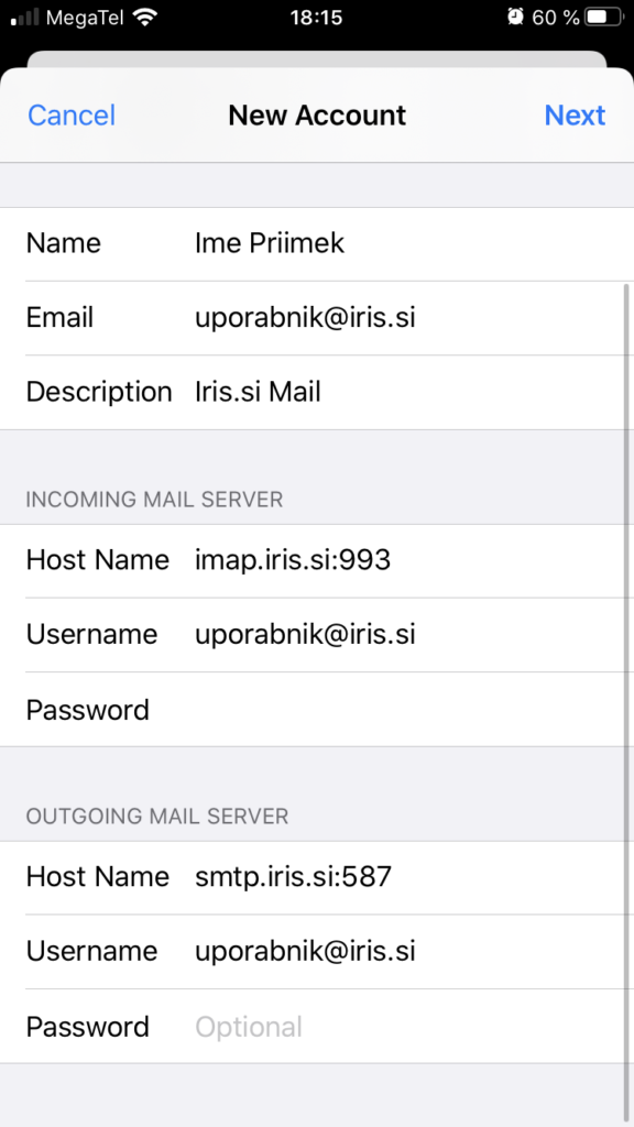 6. Izberete IMAP tip računa in izpolnite z vašimi podatki, kot prikazuje slika
