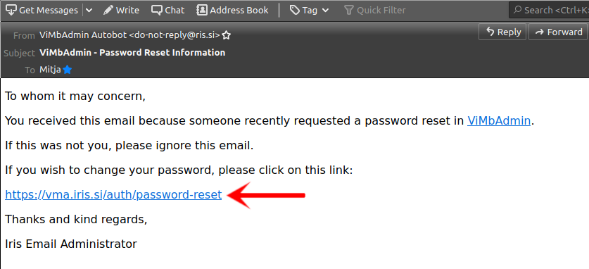 V primeru, da pozabite geslo za vaš račun elektronske pošte in imate še vedno dostop do računa vaše elektronske pošte, potem lahko pozabljeno geslo zamenjate preko portala https://vma.iris.si/.