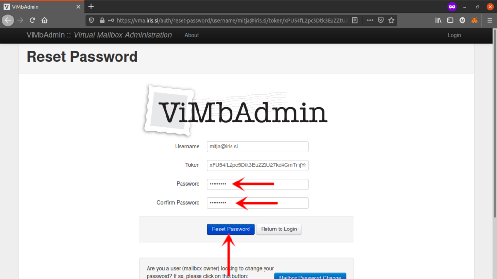 6. V okno za menjavo gesla, bodo polja “Username” in “Token” že predizpolnjena. Izpolniti morate dva polja, kamor dvakrat vpišete novo geslo. Poskrbite za ustrezno kompleksnost gesla. Menjavo gesla potrdite s pritiskom na gumb “Reset Password”.