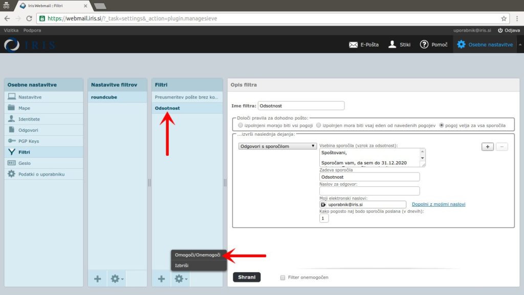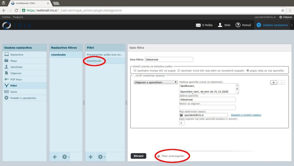S pravili ali filtri lahko e-poštna sporočila posredujete tudi v drug račun, jih označite kot prebrana ali jih samodejno premaknete v mapo. Če želite več informacij o delu s pravili, preberite Webmail – Upravljanje e-poštnih sporočil s pravili.