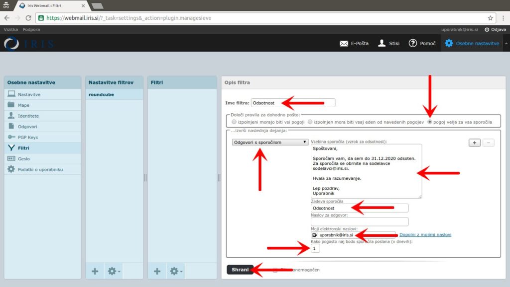 5. Dodate nov filter za pošiljanje samodejnih odgovorov o odsotnosti, kot kaže slika